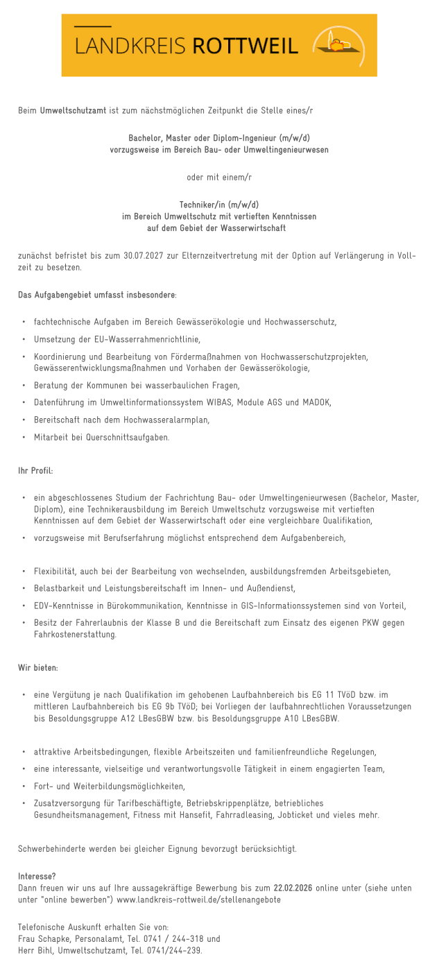 Beim Umweltschutzamt ist zum nächstmöglichen Zeitpunkt die Stelle eines/-r Bachelor, Master oder Diplom-Ingenieur (m/w/d) vorzugsweise im Bereich Bau- oder Umweltingenieurwesen oder mit einem/-r Techniker/-in (m/w/d) im Bereich Umweltschutz mit vertieften Kenntnissen auf dem Gebiet der Wasserwirtschaft zu besetzen.