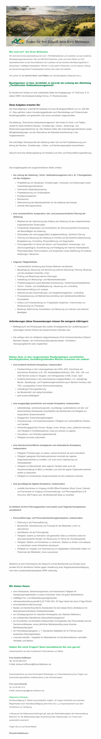 Der Kreis Mettmann sucht für das Amt für Hoch- und Tiefbau zum nächstmöglichen Zeitpunkt eine/-n Bauingenieur/-in bzw. Architekt/-in (m/w/d) als Leitung der Abteilung „Technisches Gebäudemanagement“.