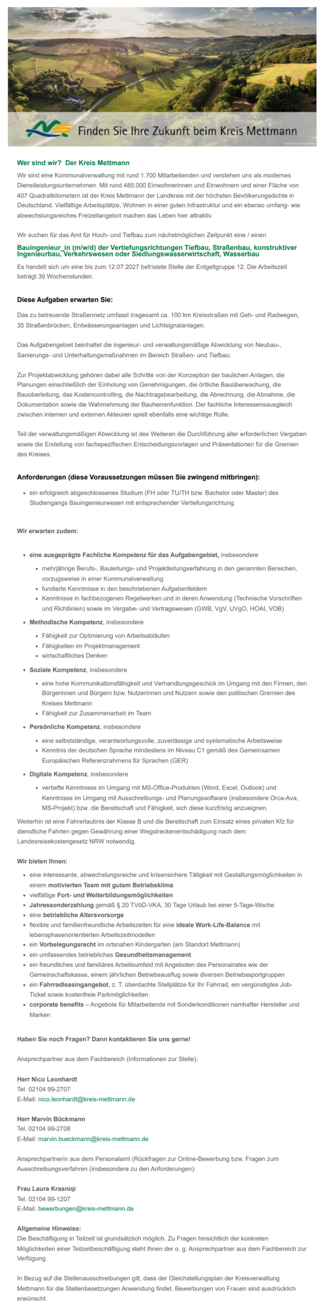 Der Kreis Mettmann sucht zum nächstmöglichen Zeitpunkt eine/-n Bauingenieur/-in (m/w/d) der Vertiefungsrichtungen Tiefbau, Straßenbau, konstruktiver Ingenieurbau, Verkehrswesen, Siedlungswasserwirtschaft oder Wasserbau.
