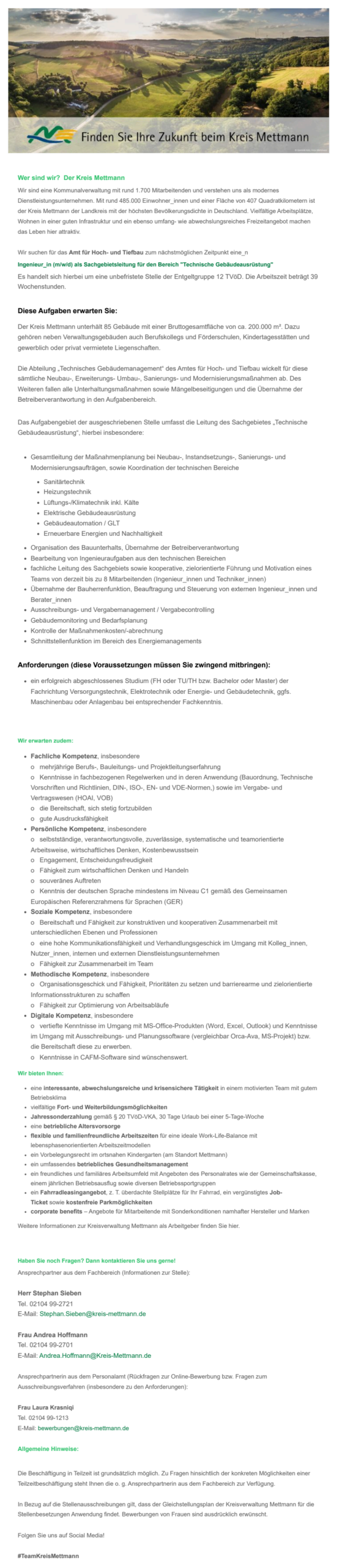 Der Kreis Mettmann sucht für das Amt für Hoch- und Tiefbau zum nächstmöglichen Zeitpunkt eine/-n Ingenieur/-in (m/w/d) als Sachgebietsleitung für den Bereich „Technische Gebäudeausrüstung“.
