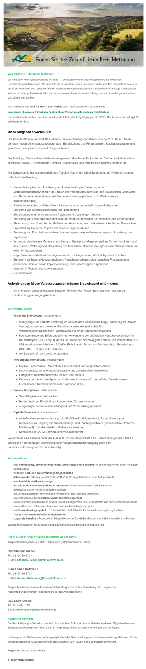 Der Kreis Mettmann sucht für das Amt für Hoch- und Tiefbau zum nächstmöglichen Zeitpunkt eine/-n Ingenieur/-in (m/w/d) der Fachrichtung Versorgungstechnik als Objektleitung.