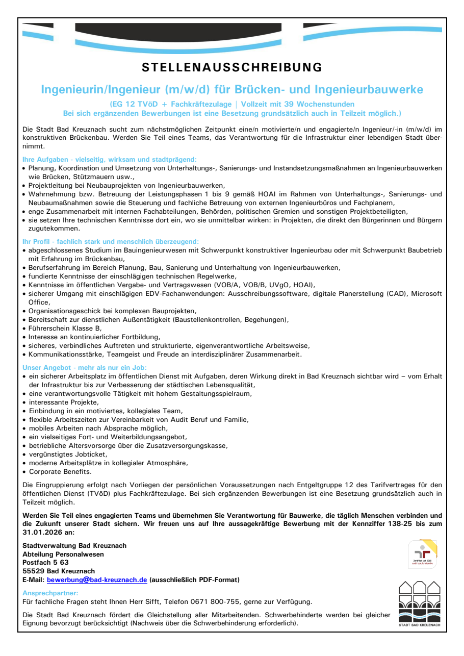 Die Stadt Bad Kreuznach sucht für zum nächstmöglichen Zeitpunkt eine/-n motivierte/-n Ingenieur/-in (m/w/d) im konstruktiven Brückenbau.
